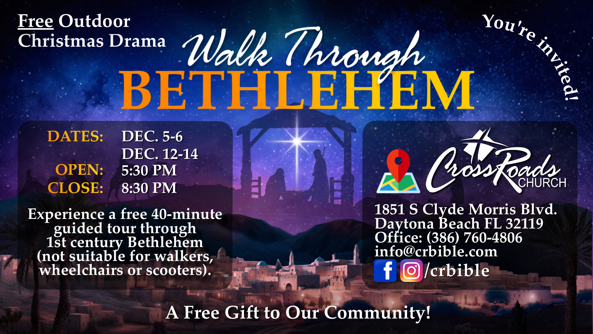 Walk Through Bethlehem will run December 5-6 and 12-14 from 5:30PM-8:30PM at CrossRoads Church (1851 S Clyde Morris) and is a FREE event for the whole family!